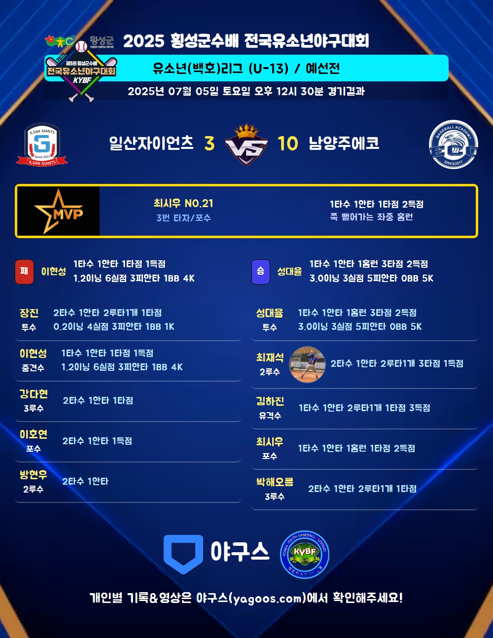 | 일산자이언츠 | 1 | 1 | 1 | 0 | 0 | 3 | 5 | 0 | 4 | 5 |