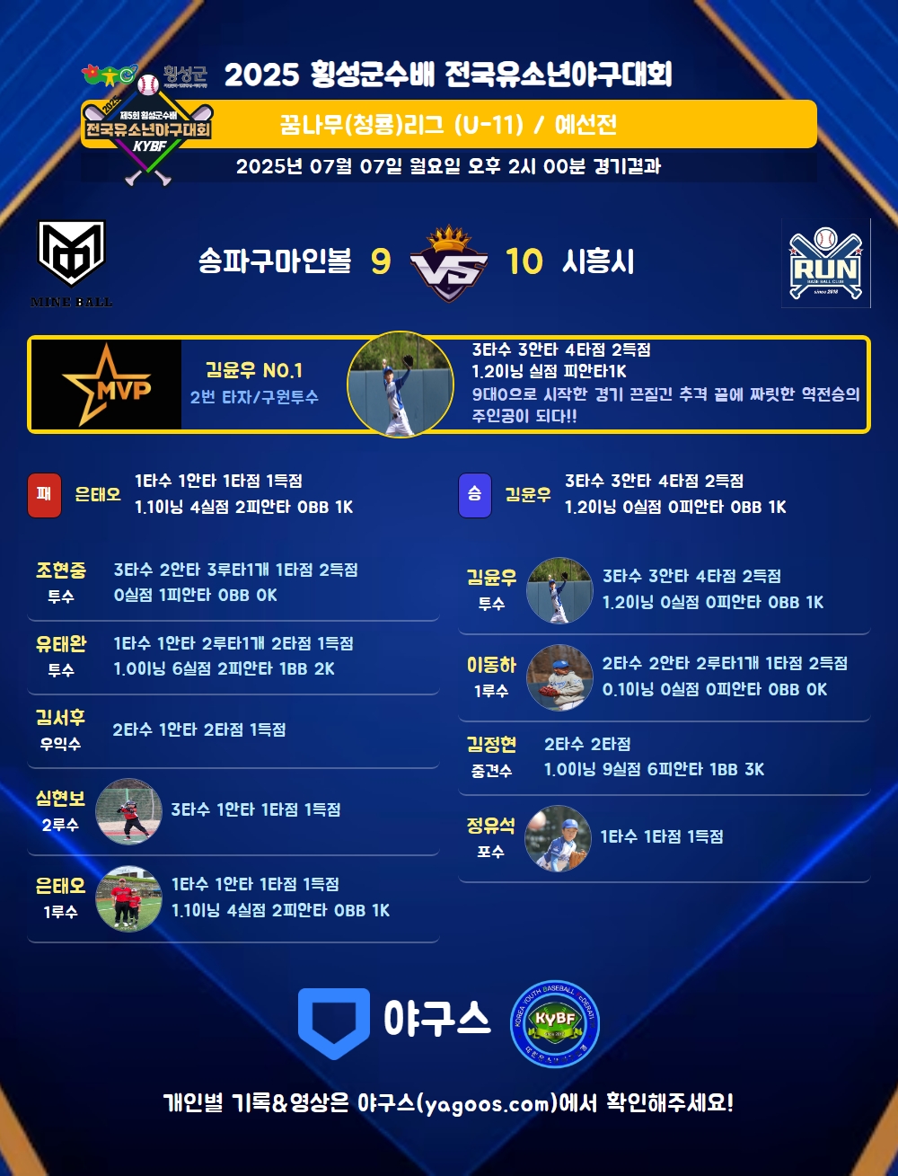 | 9 | 우 | 김서후(170) | 중안(2타점) | - | 3직 | - | - | 2 | 1 | 2 | 1 | - | - | - | - | 0.500 |
