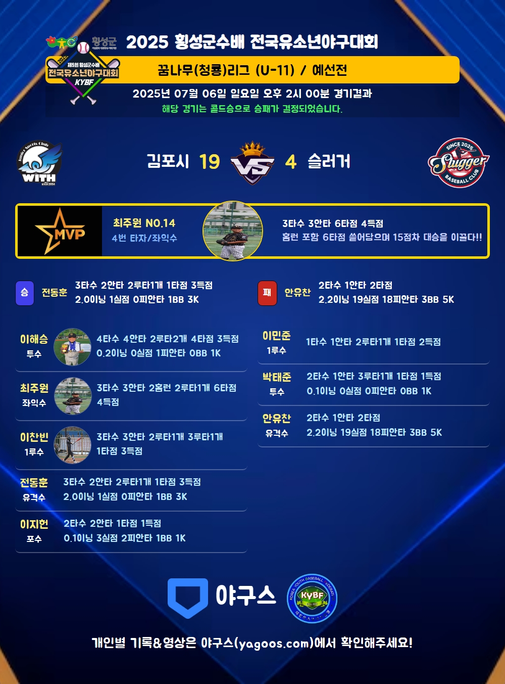 | 2루타 | 이찬빈(99) 전동훈(17) 최주원(14) 이해승(7) 이준현(23) 김태윤(48) 이민준(2) |
