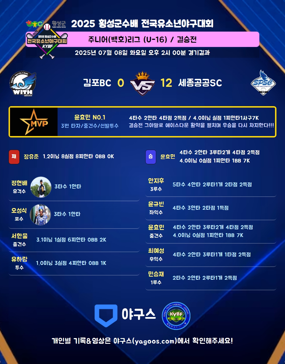 | 3 | 중 | 윤효민(1) | 우중3(2타점) | 우선3(2타점) | - | 유땅 | 삼진 | - | - | 4 | 2 | 4 | 2 | - | - | - | 1 | 0.500 |