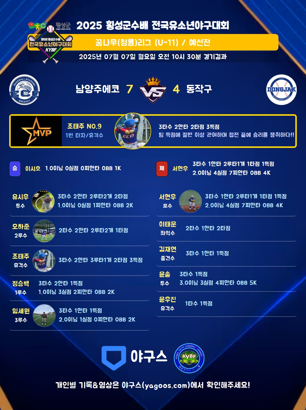| 7 | 좌 | 이태운(11) | - | 투땅 | - | 중안(2타점) | - | 2 | 1 | 2 | - | - | - | - | - | 0.500 |