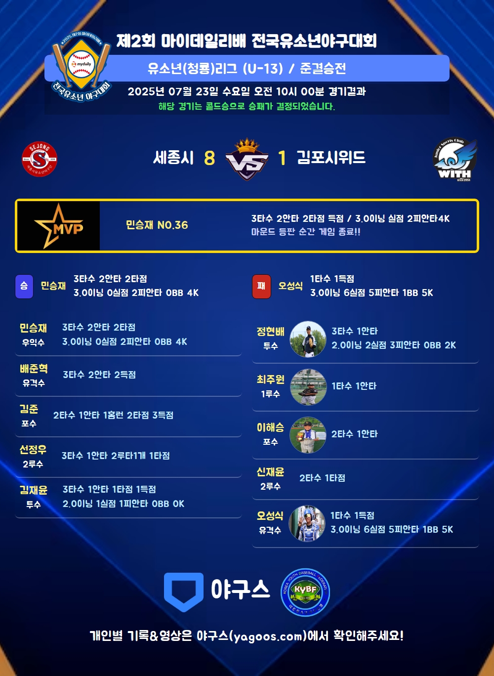 | 5 | 우 | 민승재(36) | 3내안(1타점) | 중안(1타점) | - | 중플 | - | - | 3 | 2 | 2 | - | - | 1 | - | - | 0.667 |