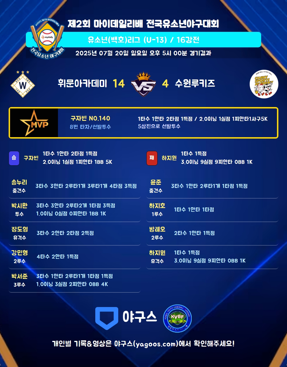 | 2 | 一 | 조예준(8) | 중플 | 중플 | 중플 | 좌안(1타점) | - | 4 | 1 | 1 | - | - | - | - | - | 0.250 |