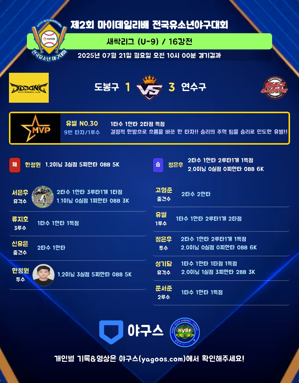 | 4 | 유 | 서은우(50) | 2직 | - | 우월3(1타점) | - | - | 2 | 1 | 1 | - | - | - | - | - | 0.500 |