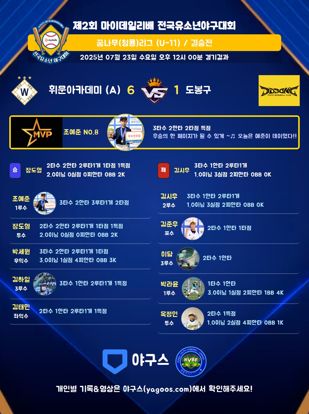 | 2 | 一 | 조예준(8) | 삼진 | - | 우월3(1타점) | - | 우월안(1타점) | 3 | 2 | 2 | - | - | - | - | 1 | 0.667 |