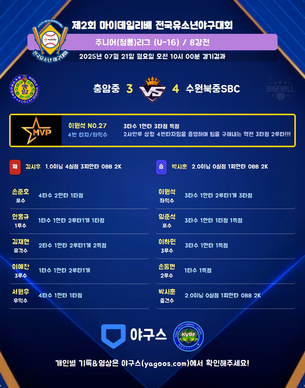 | 수원북중SBC | 0 | 0 | 0 | 0 | 0 | 4 | 0 | 4 | 3 | 1 | 2 | 1 |