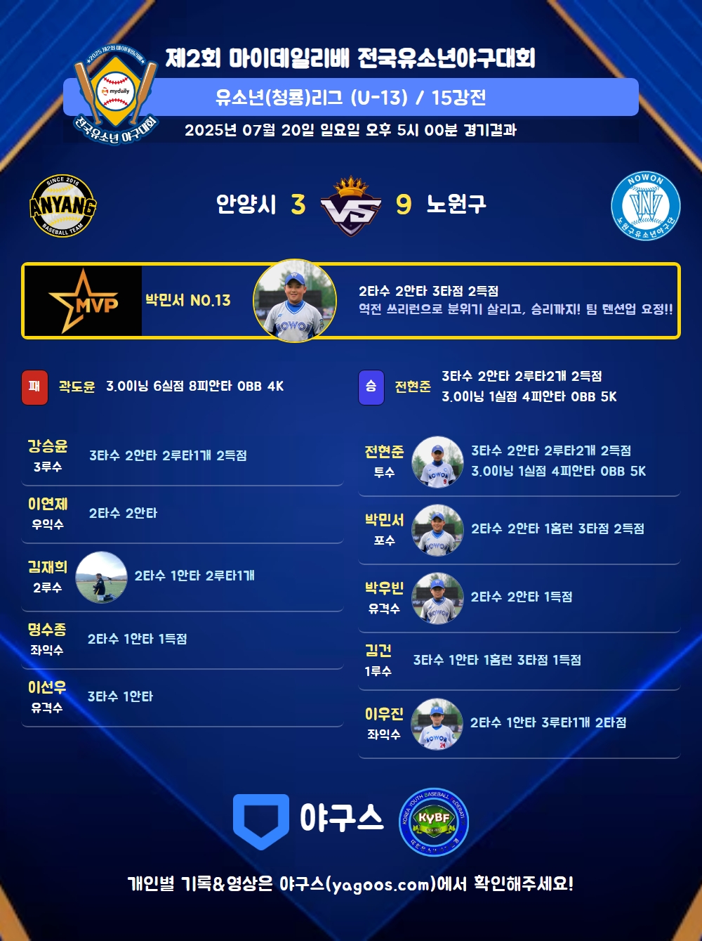 | 3 | 포 | 박민서(13) | 우안 | - | 좌중홈(3타점) | 고의4구 | - | - | 2 | 2 | 3 | 2 | 1 | 1 | 1 | - | 1.000 |