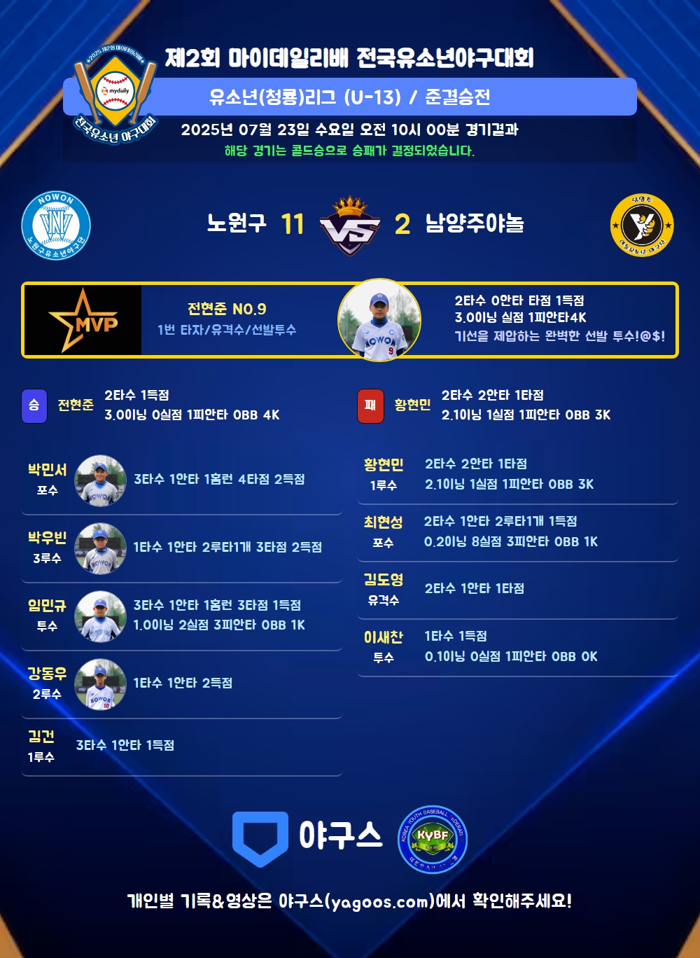 | 3 | 포 | 박민서(13) | 삼진 | - | 좌월홈(3타점) | 2실(1타점) | - | - | 3 | 1 | 4 | 2 | 1 | - | - | 1 | 0.333 |