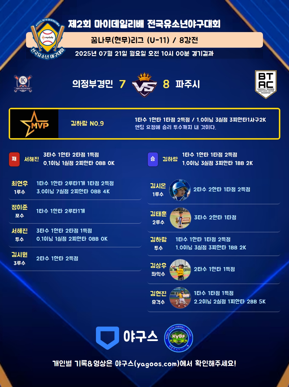 | 2 | 一 | 김시온(6) | 3내안(1타점) | 4구 | - | 좌중안 | - | 2 | 2 | 1 | 2 | - | 2 | 1 | - | 1.000 |