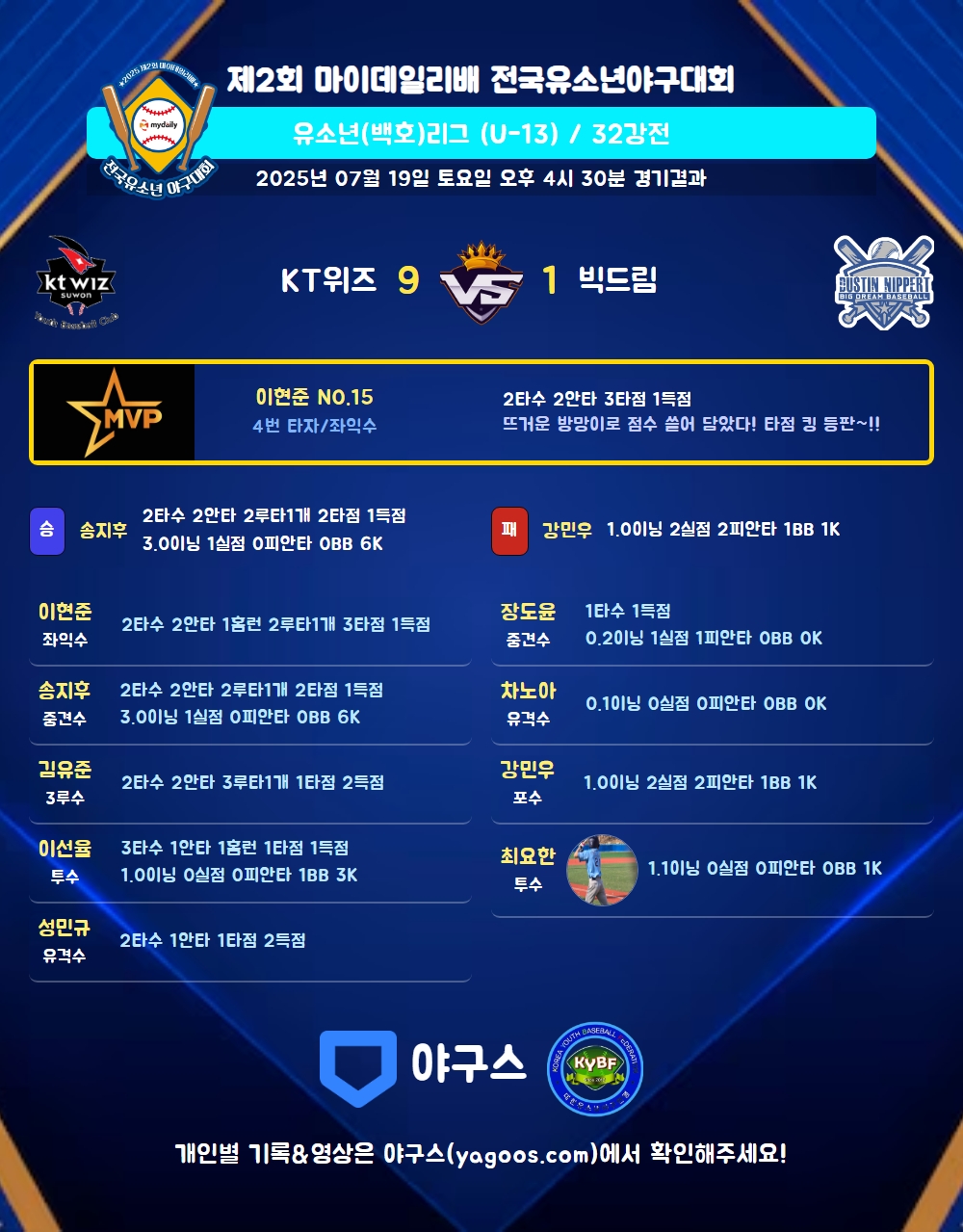 | 홈런 | 이현준(15) 이선율(44) |