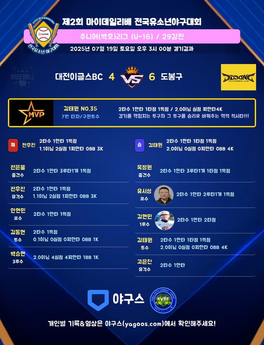 | 대전이글스BC | 1 | 0 | 3 | 0 | 0 | 0 | 0 | 4 | 3 | 0 | 6 | 6 |