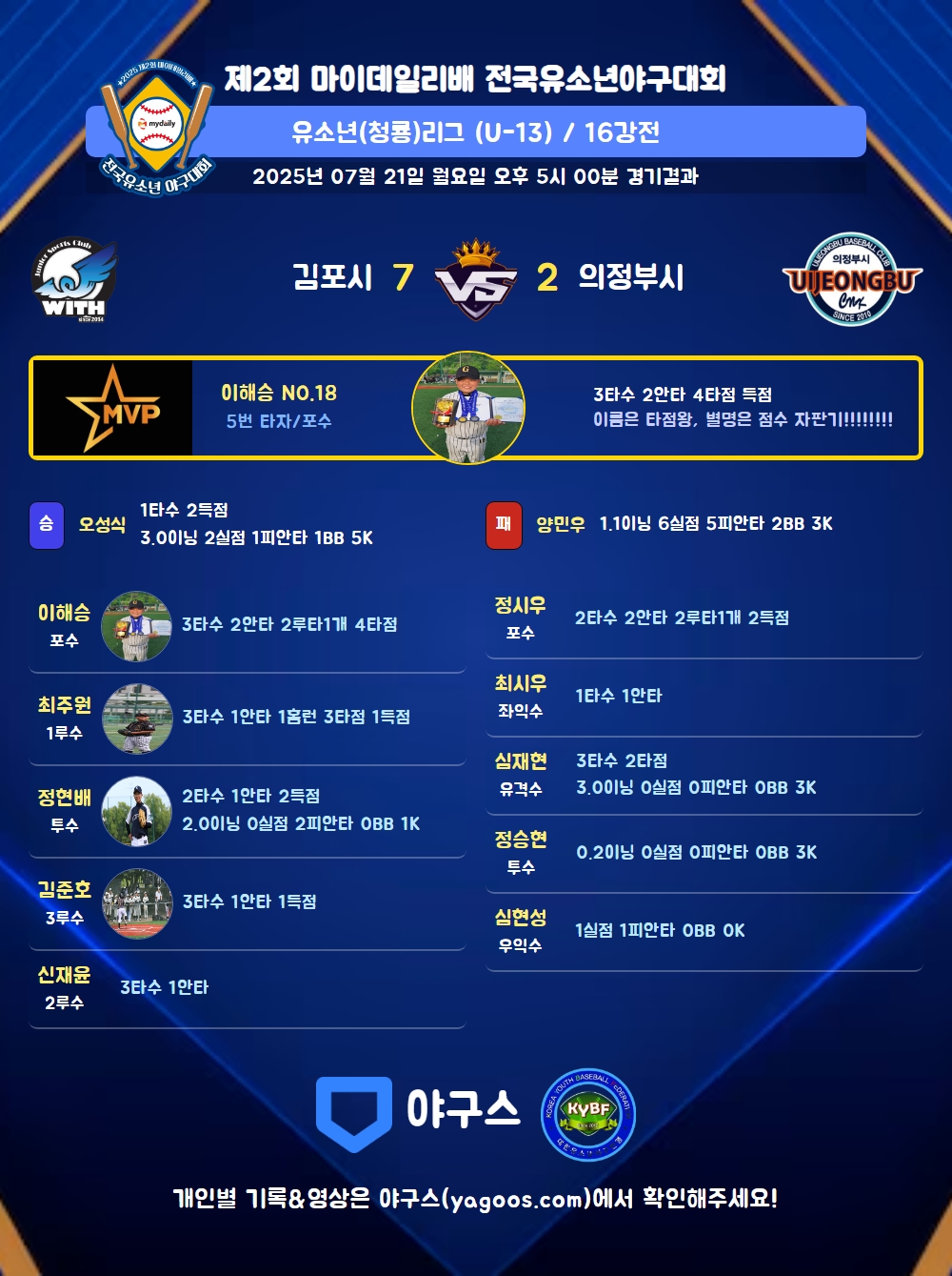 | 김포시위드 | 2 | 5 | 0 | 0 | 0 | 0 | 7 | 6 | 1 | 5 | 5 |
