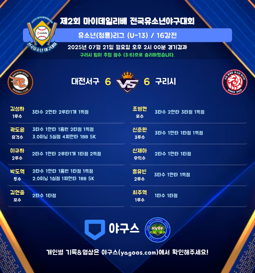 | 대전서구 | 3 | 2 | 1 | 0 | 0 | 0 | 6 | 5 | 2 | 3 | 0 |