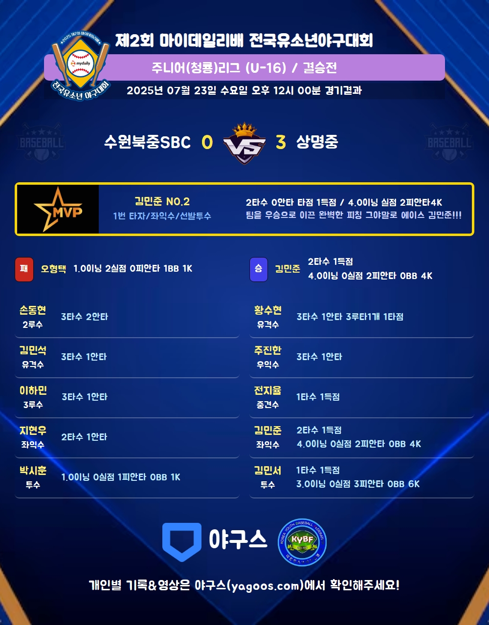 | 수원북중SBC | 0 | 0 | 0 | 0 | 0 | 0 | 0 | 0 | 5 | 1 | 3 | 6 |