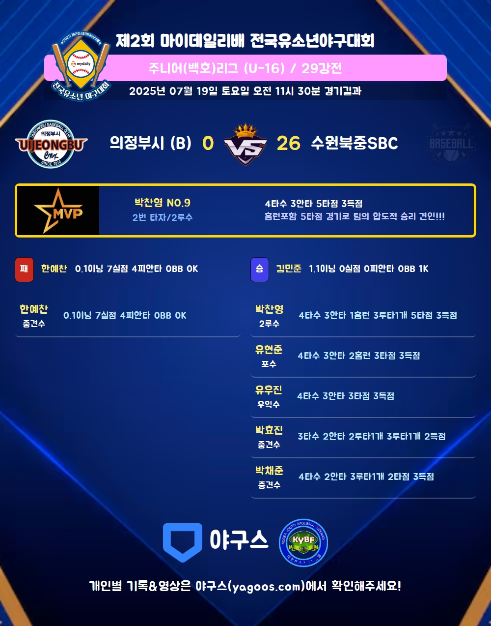 | 3루타 | 박채준(8) 박찬영(9) 박효진(17) 김태윤(28) |