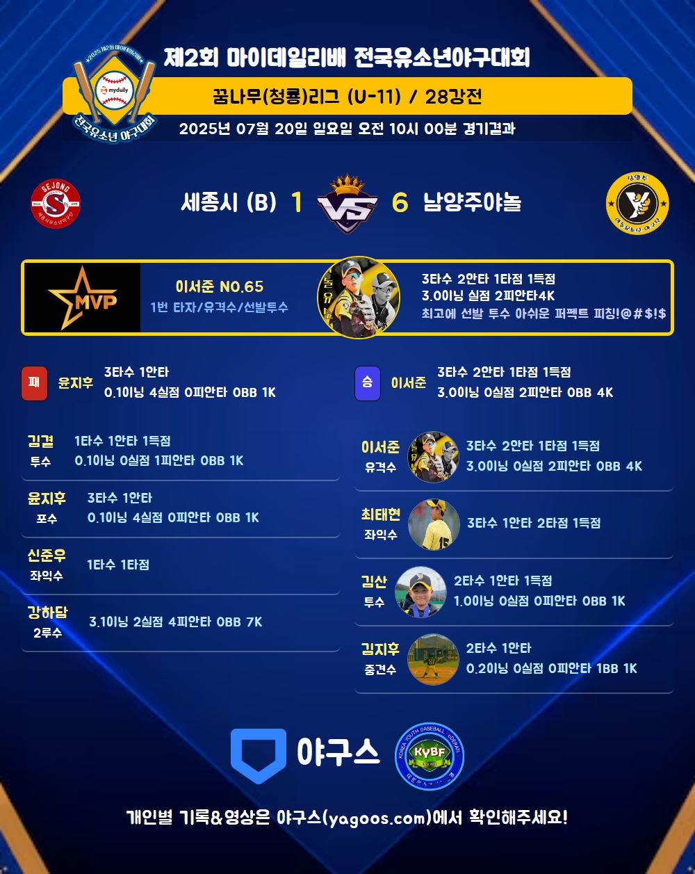 | 6 | 우 | 조민율(77) | - | 2땅 | - | 삼진 | - | 2 | 0 | - | - | - | - | - | 1 | 0.000 |