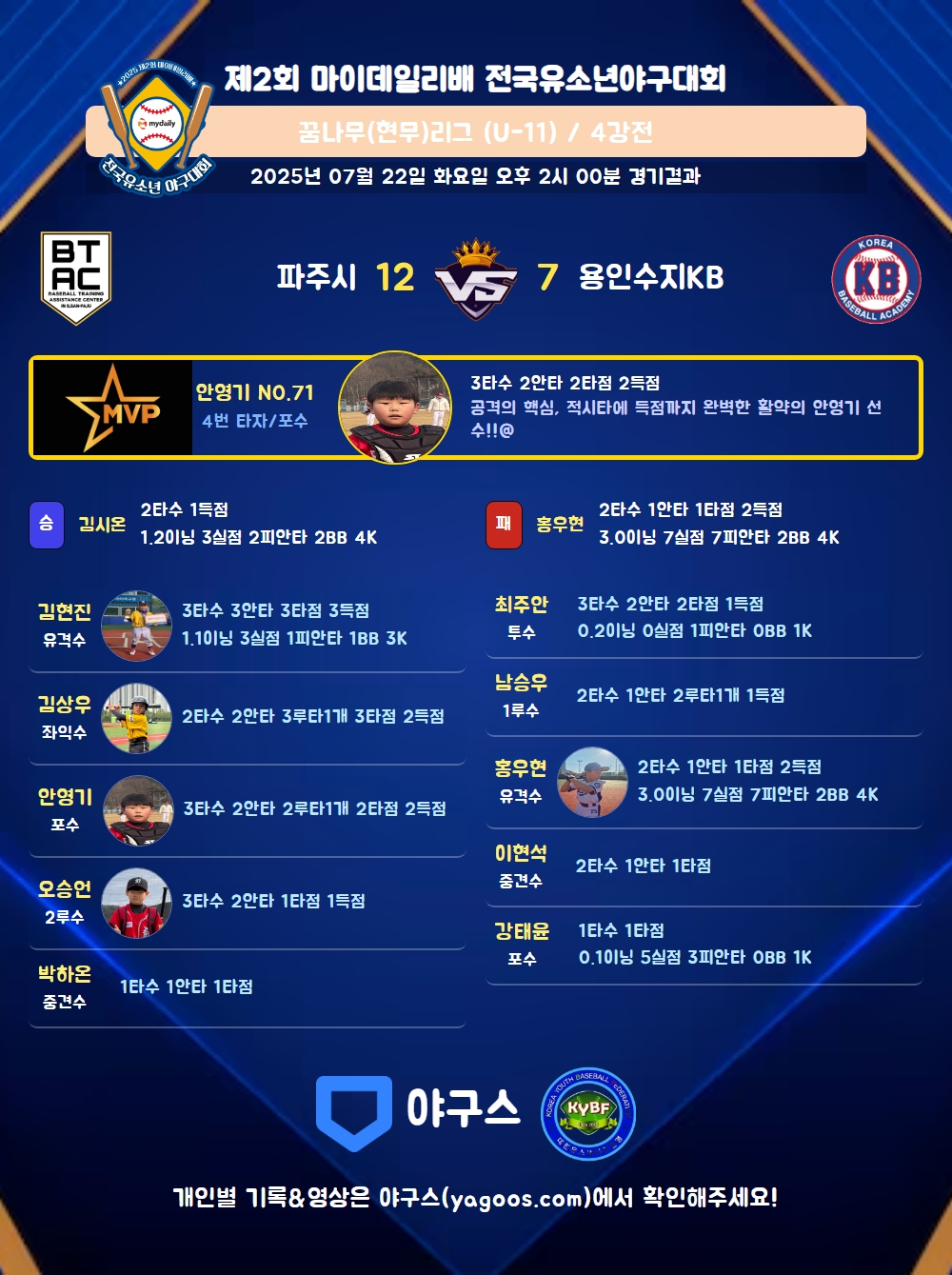 | 3 | 포 | 강태윤(23) | 4구 | 사구(1타점) | - | 1땅 | - | 1 | 0 | 1 | - | - | 2 | 2 | - | 0.000 |