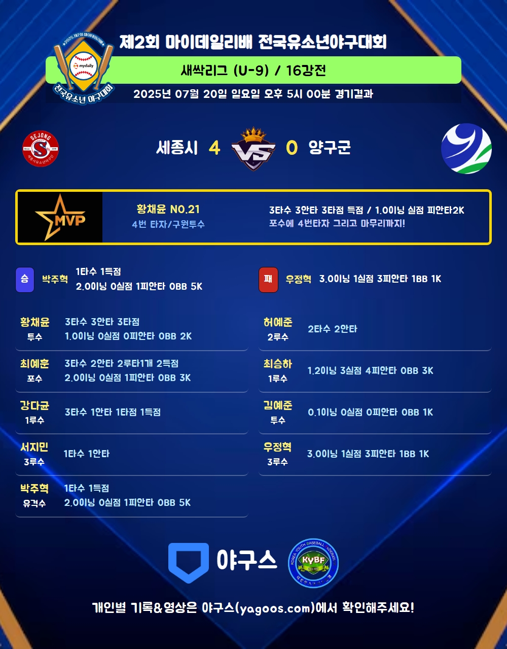 | 3 | 황채윤(21) | 세이브 | 1.0 | 4 | 3 | - | - | 1 | 2 | 12 | - | - | 0 |