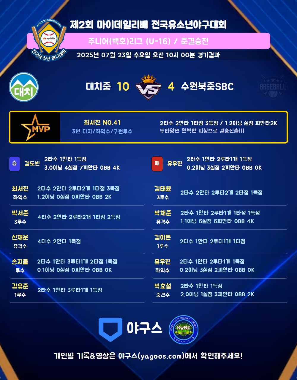 | 2루타 | 박서준(24) 최서진(41) 유우진(20) 박채준(8) 김태윤(28) 김이든(13) |