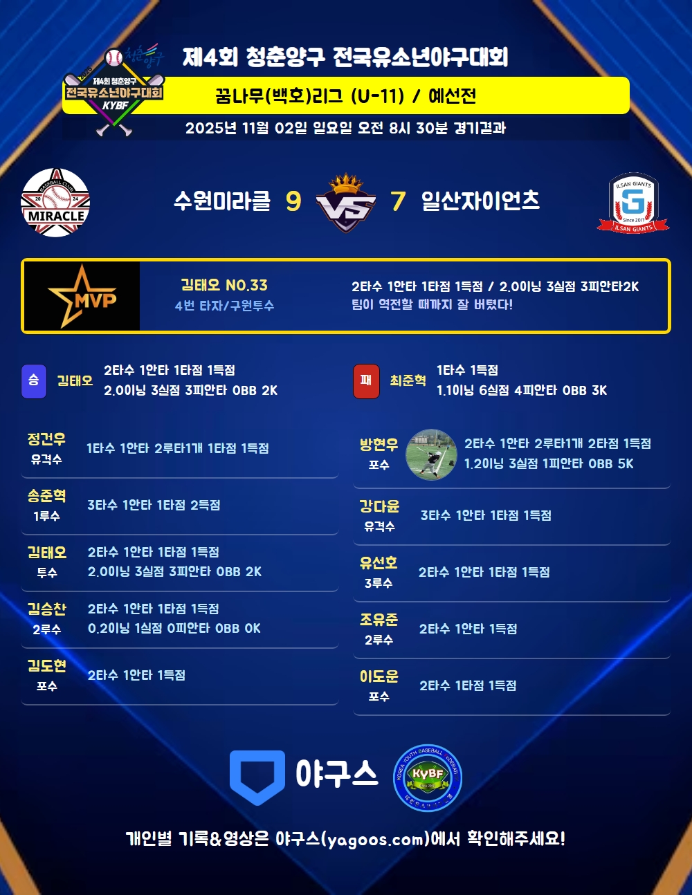 | 1 | 유 | 강다윤(39) | 유땅 | 중안(1타점) | 투땅 | - | 3 | 1 | 1 | 1 | - | 1 | - | - | 0.333 |