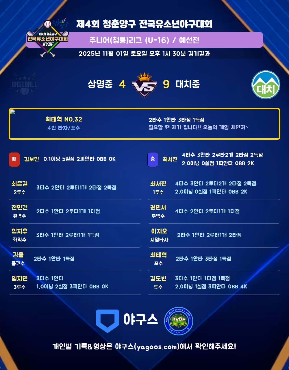 | 2루타 | 임지우(17) 최은결(4) 전민건(27) 최서진(41) 권민서(31) 이지오(52) |