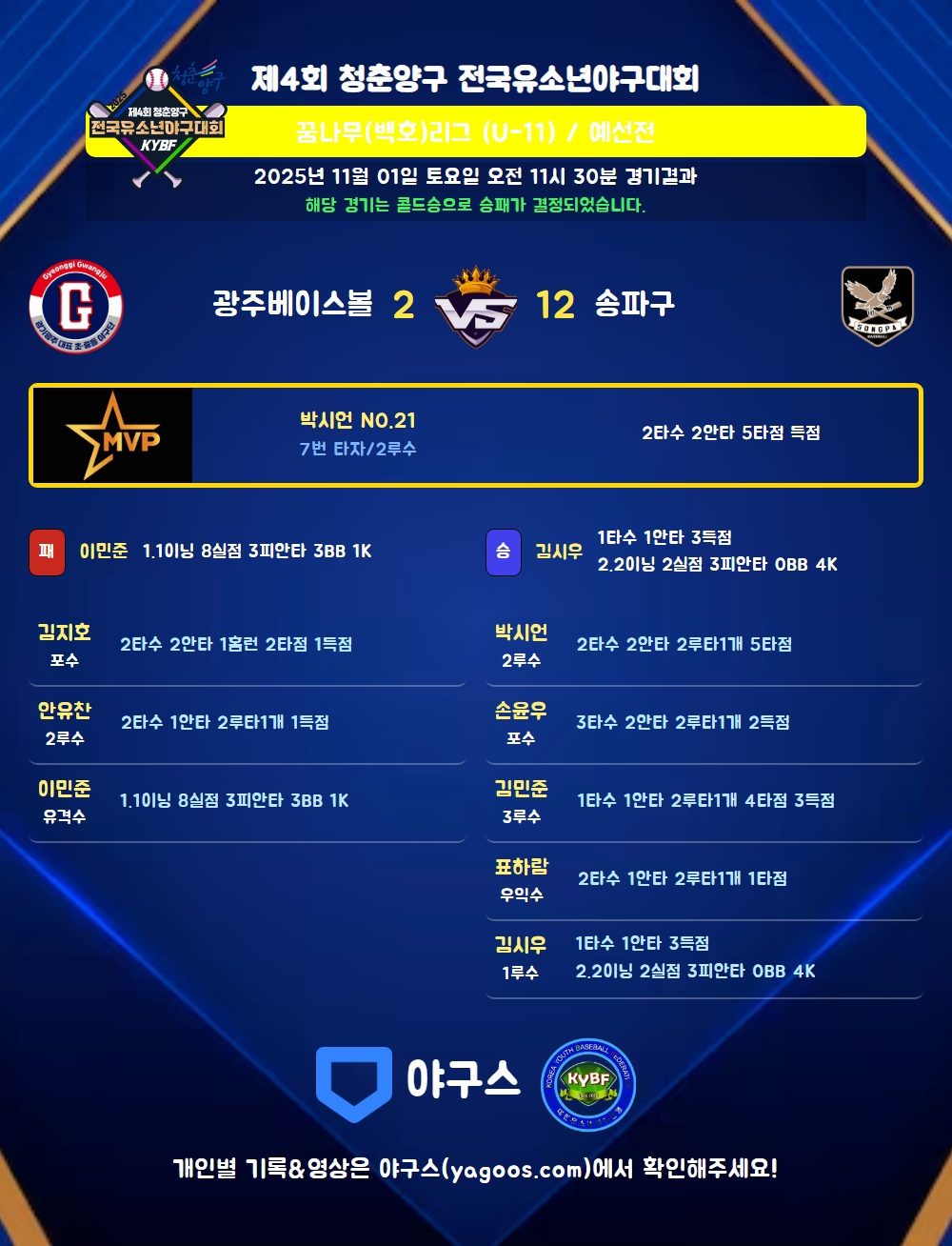 | 2루타 | 안유찬(9) 손윤우(23) 김민준(32) 박시언(21) 표하람(121) |