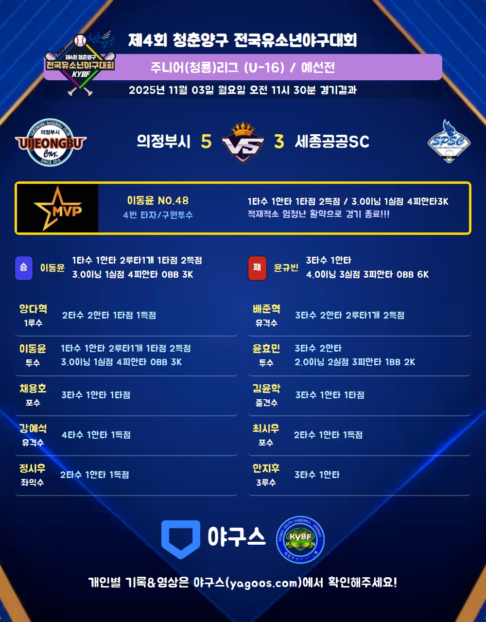 | 4 | 투 | 이동윤(48) | - | 4구 | 4구 | - | 좌중2(1타점) | 사구 | - | 1 | 1 | 1 | 2 | - | 1 | 3 | - | 1.000 |