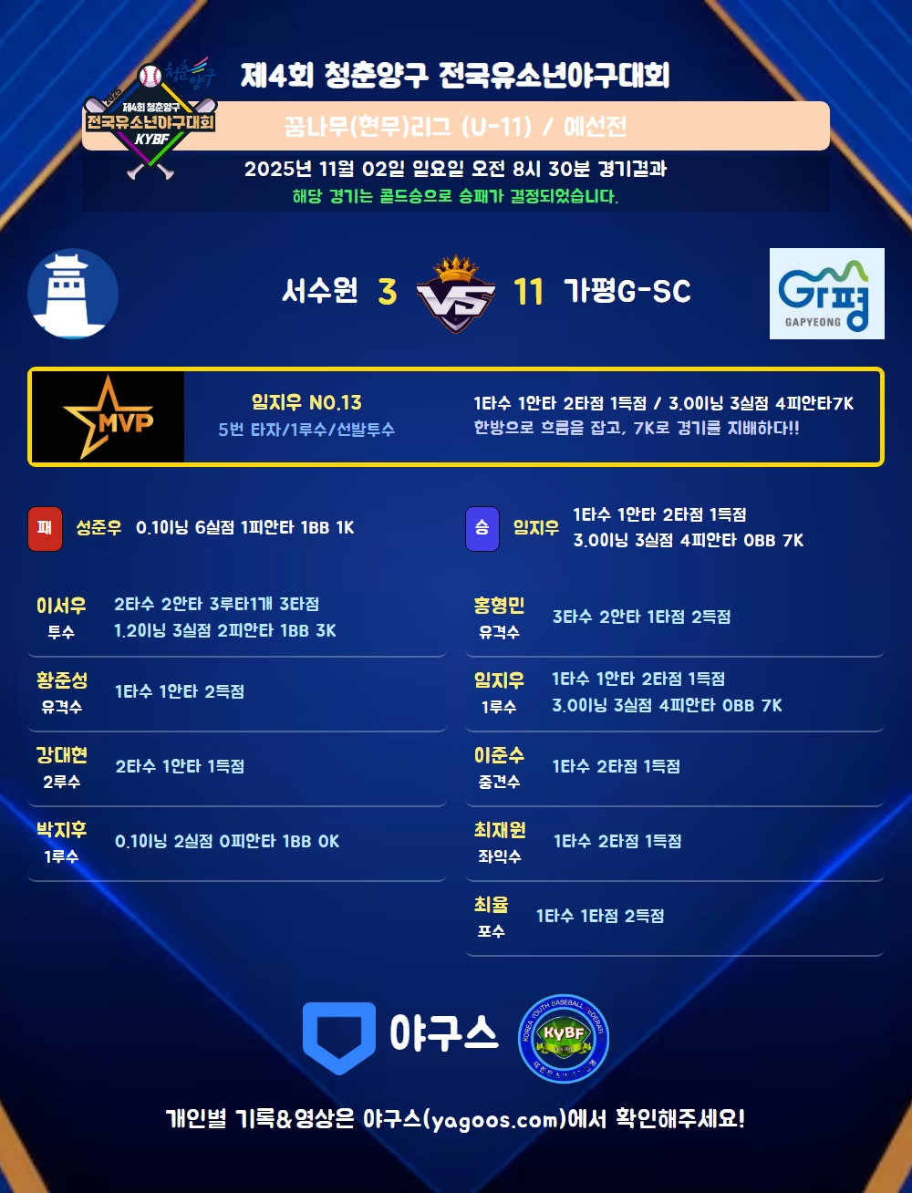 | 1 | 임지우(13) | 승 | 3.0 | 13 | 12 | 4 | - | 1 | 7 | 53 | 3 | 3 | 9.00 |