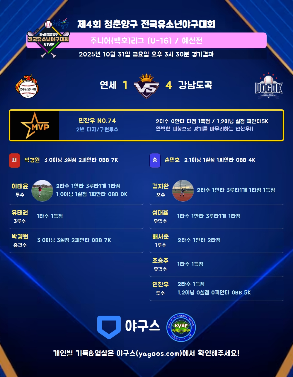 | 4 | 一 | 배서준(2) | 2땅(1타점) | - | 중안(1타점) | - | - | 2 | 1 | 2 | - | - | - | - | - | 0.500 |