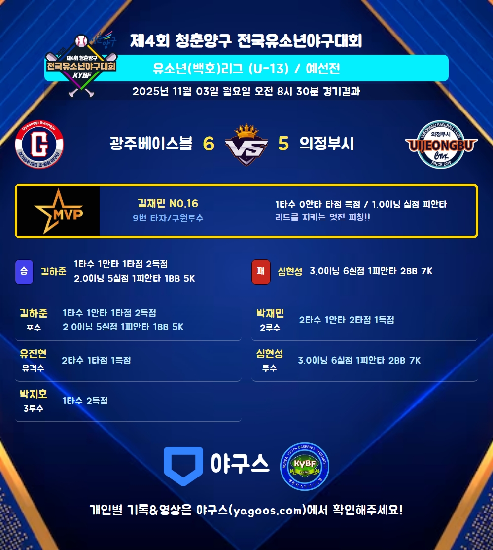 | 광주베이스볼 | 2 | 4 | 0 | 0 | 6 | 1 | 3 | 8 | 4 |
