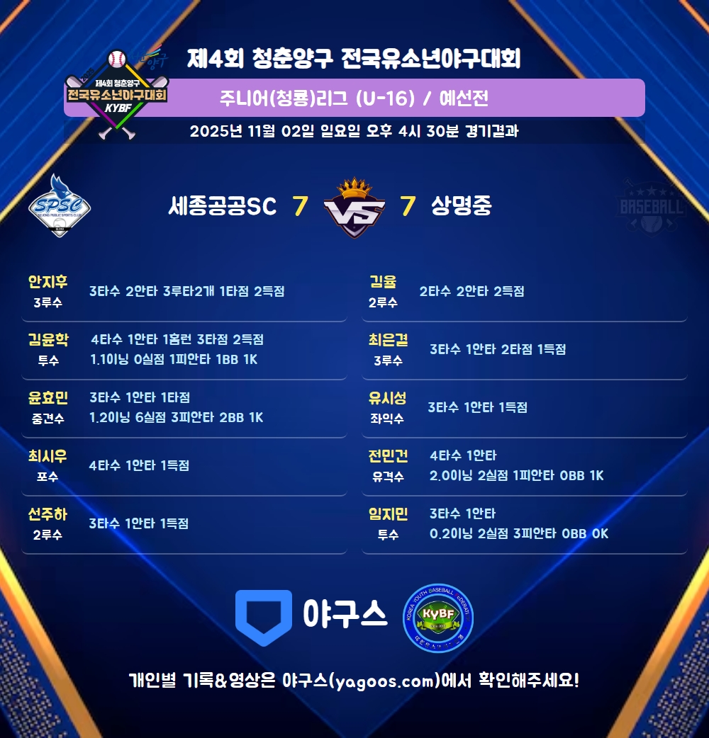 | 5 | 좌 | 윤규빈(3) | - | 투땅 | - | 중플 | - | 4구 | 유내안 | - | 3 | 1 | - | - | - | - | 1 | - | 0.333 |