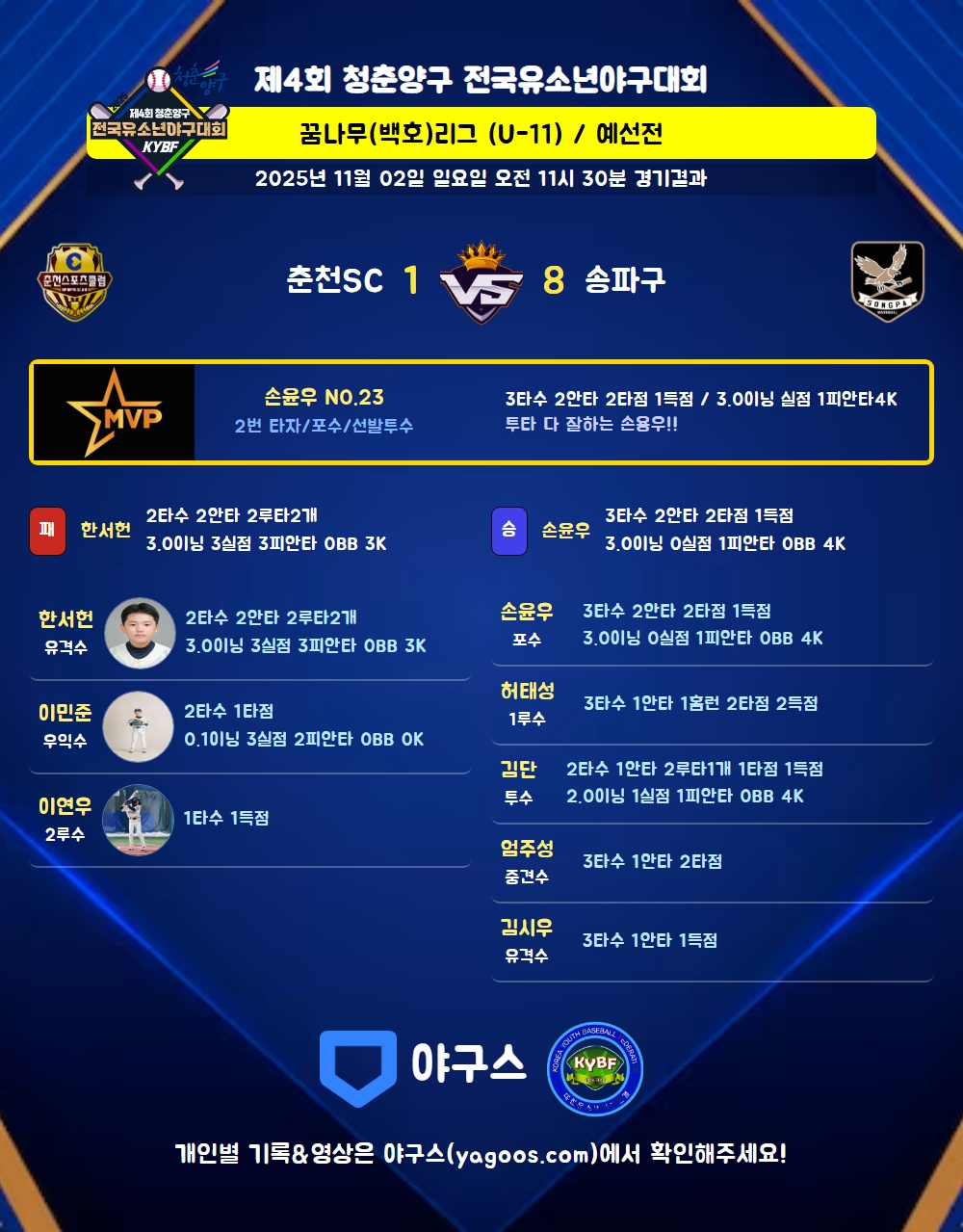 | 2 | 포 | 손윤우(23) | 중안 | 2땅출 | - | 중안(2타점) | - | 3 | 2 | 2 | 1 | - | - | - | - | 0.667 |
