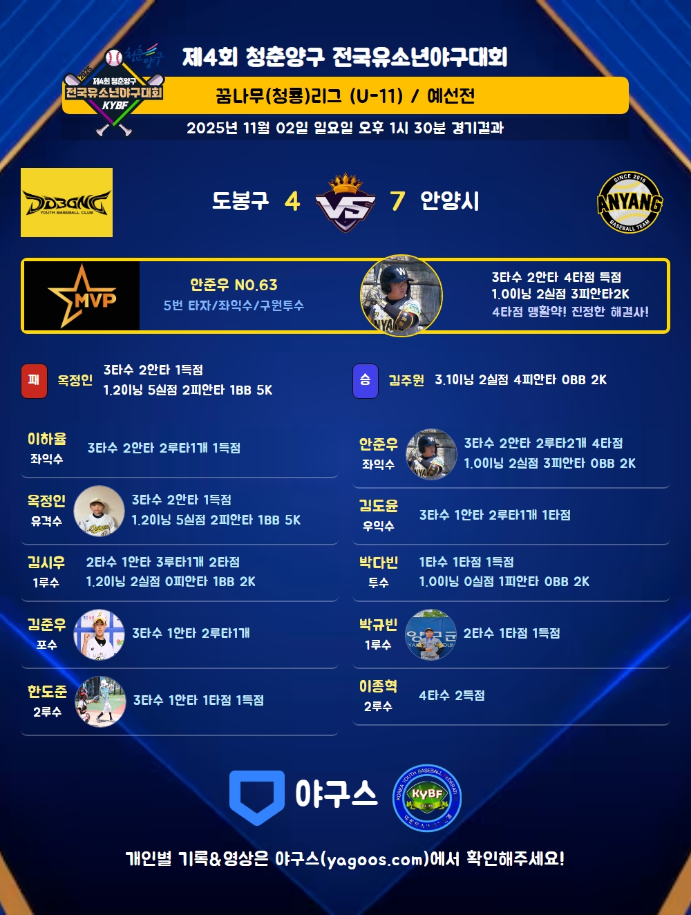 | 2루타 | 김준우(18) 이하율(1) 안준우(63) 김도윤(2) |