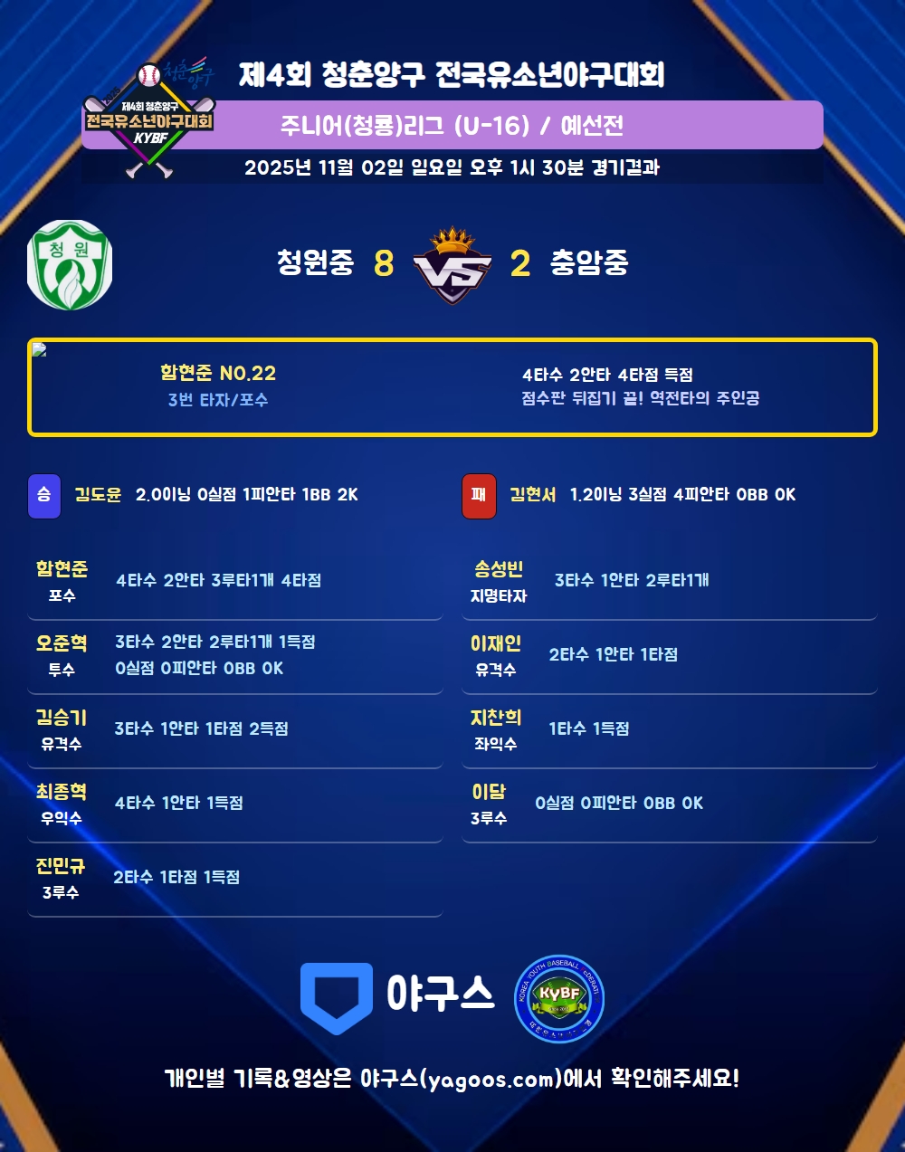 | 3 | 포 | 함현준(22) | 유땅 | - | - | 3땅 | 우안(1타점) | 좌중3(3타점) | - | 4 | 2 | 4 | - | - | - | - | - | 0.500 |