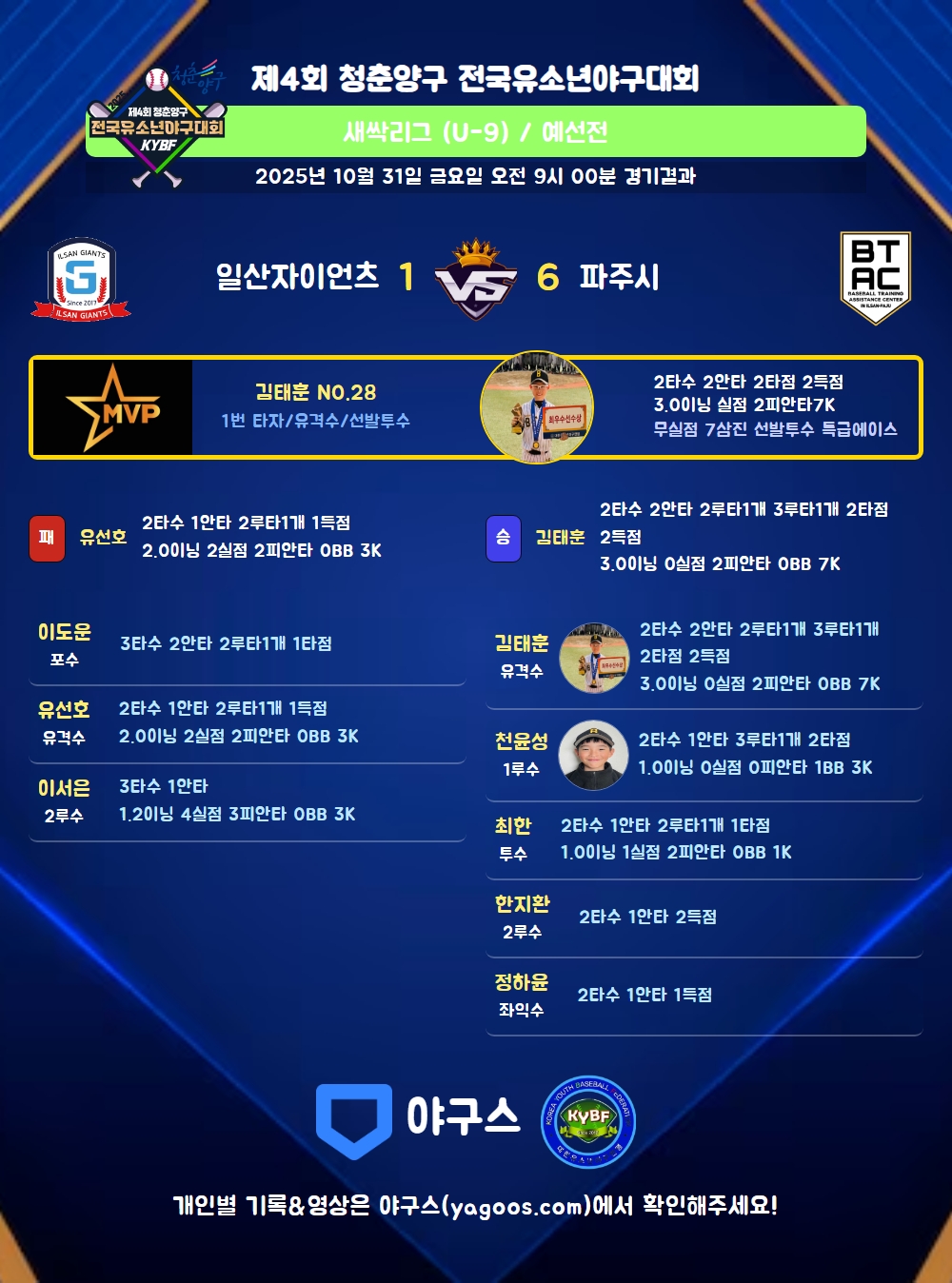 | 일산자이언츠 | 0 | 0 | 0 | 0 | 1 | 1 | 4 | 0 | 3 | 6 |