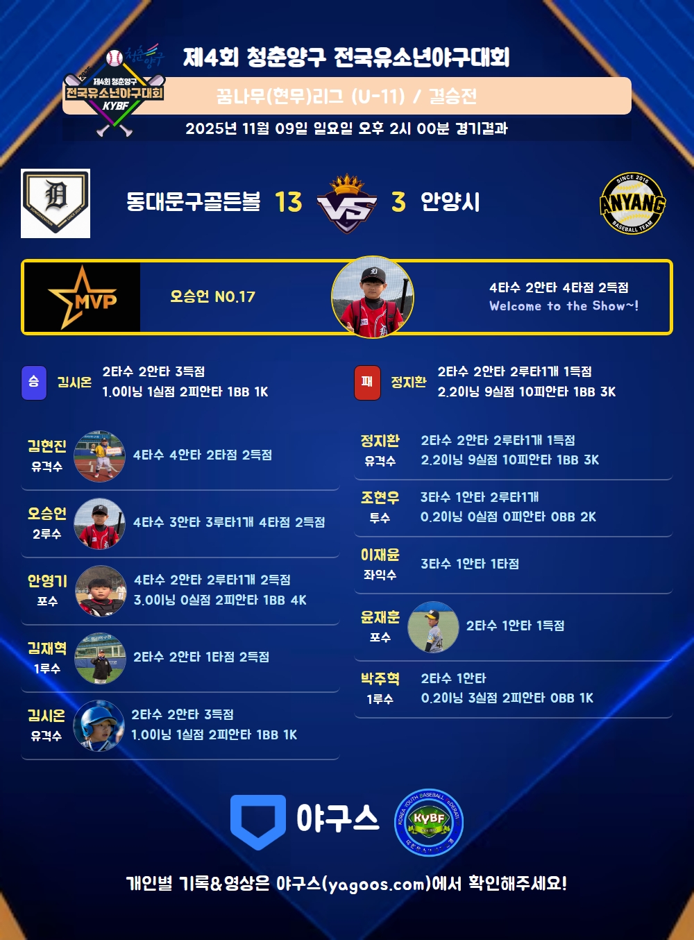 | 2 | 二 | 오승언(17) | 투내안(1타점) | 2땅(1타점) | 우선3(2타점) | - | 중안 | - | 4 | 3 | 4 | 2 | - | - | - | - | 0.750 |