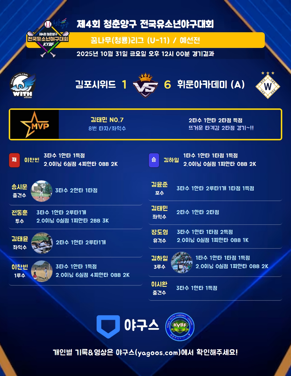 | 7 | 좌 | 김태윤(48) | - | 중월2 | - | 낫아웃삼진 | - | 2 | 1 | - | - | - | - | - | 1 | 0.500 |