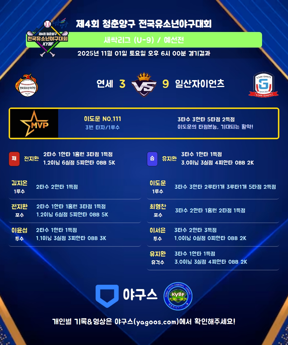 | 3 | 一 | 이도운(111) | 유내안(1타점) | 좌월3(2타점) | 좌중2(2타점) | - | 3 | 3 | 5 | 2 | - | - | - | - | 1.000 |