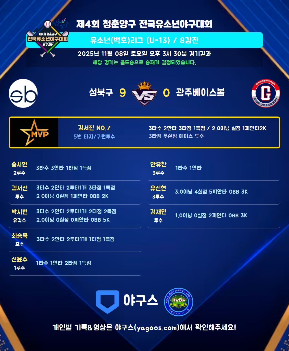 | 광주베이스볼 | 0 | 0 | 0 | 0 | 0 | 0 | 1 | 0 | 2 | 2 |