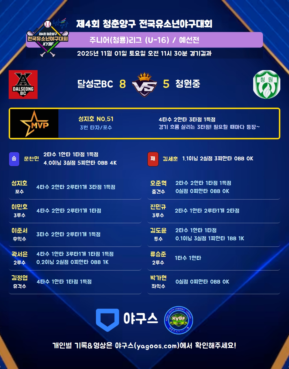 | 2루타 | 성지호(51) 이민호(10) 이준서(27) 진민규(39) |