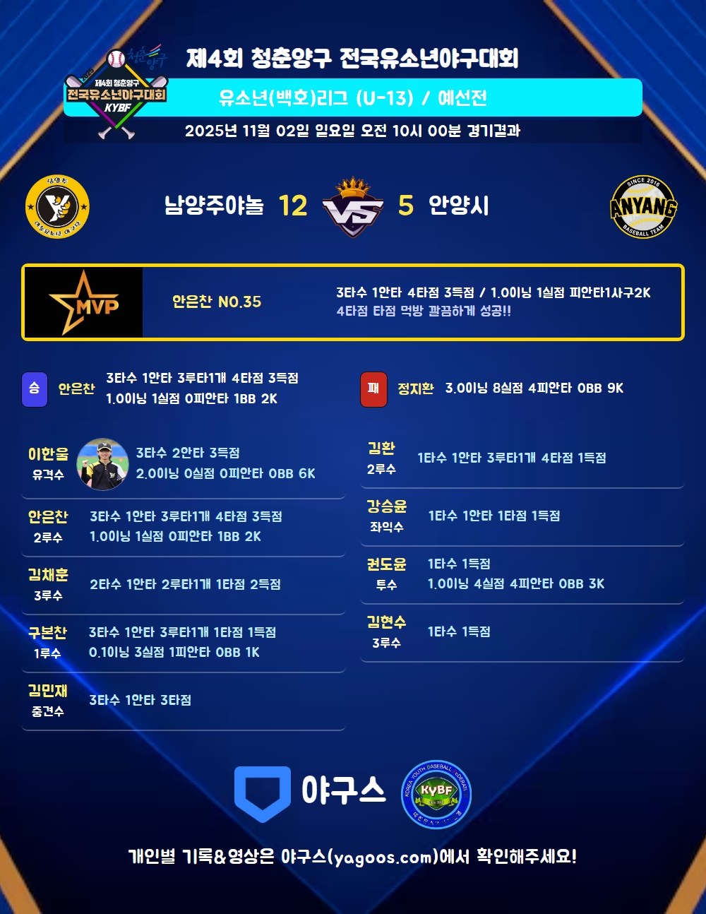 | 남양주야놀 | 5 | 3 | 0 | 4 | 0 | 12 | 8 | 0 | 2 | 2 |
