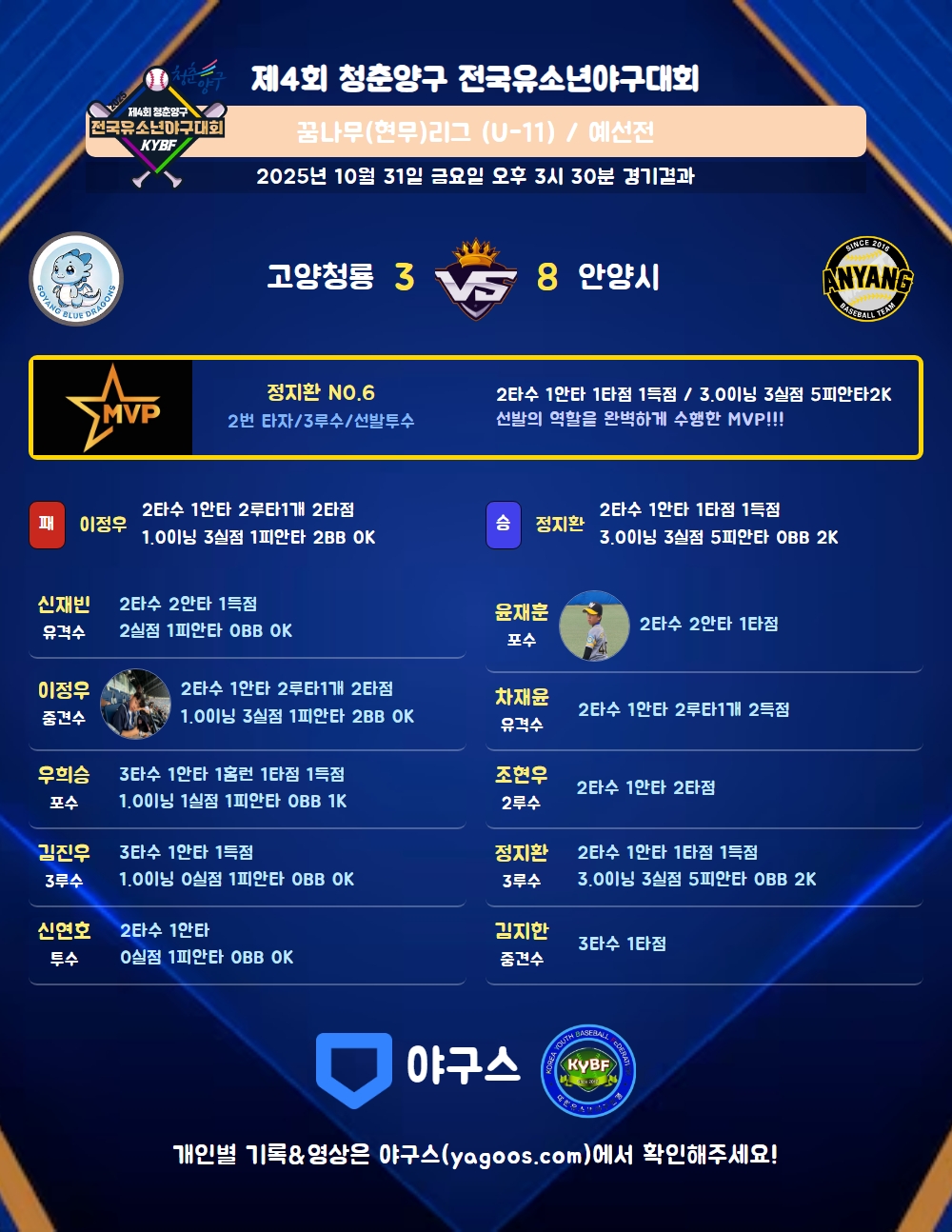 | 고양청룡 | 2 | 1 | 0 | 0 | 3 | 6 | 1 | 1 | 5 |