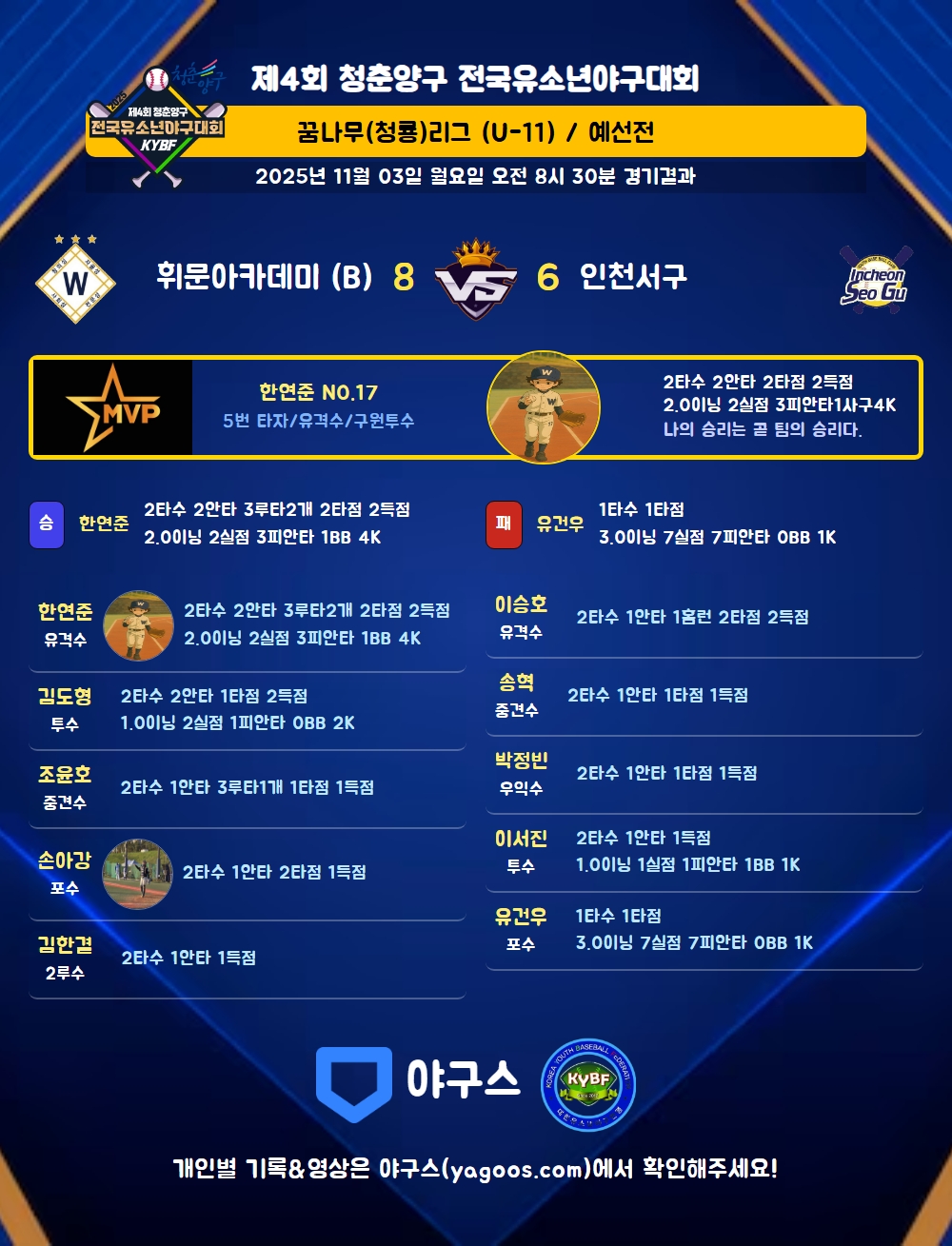 | 2 | 한연준(17) | 승 | 2.0 | 10 | 8 | 3 | - | 2 | 4 | 36 | 2 | 2 | 9.00 |