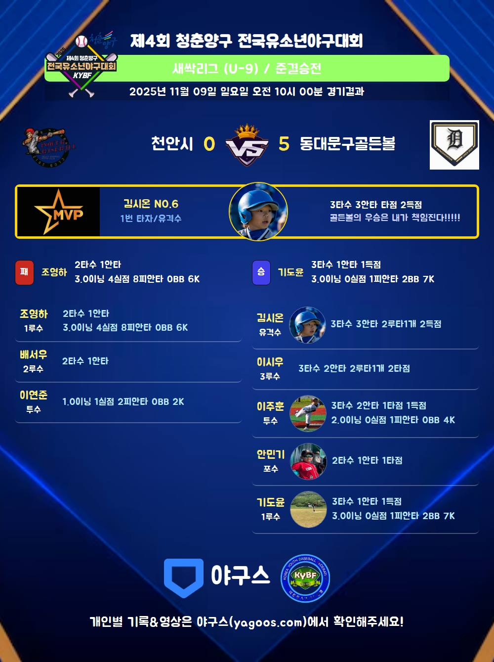 | 2 | 三 | 이시우(140) | 투땅 | 좌전2(1타점) | - | 중안(1타점) | - | 3 | 2 | 2 | - | - | - | - | - | 0.667 |