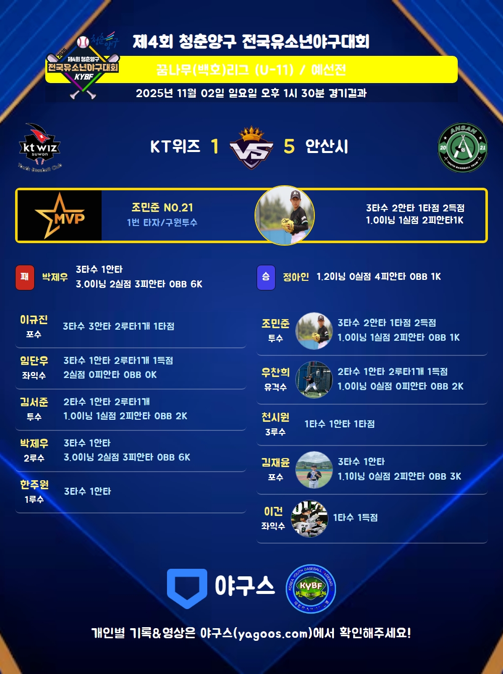 | 2루타 | 김서준(36) 임단우(35) 이규진(22) 우찬희(98) |