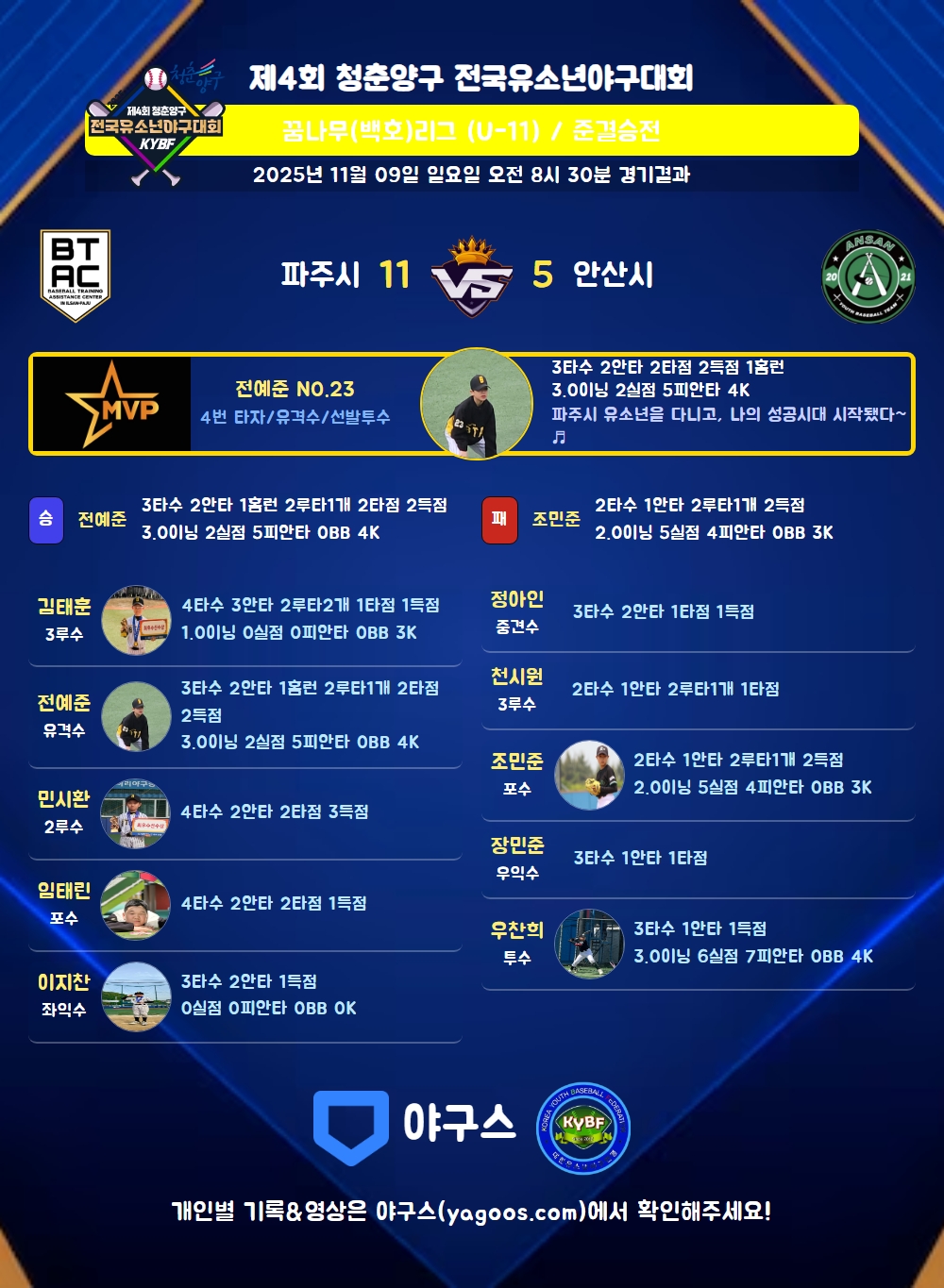 | 2루타 | 김태훈(28) 전예준(23) 조민준(21) 천시원(17) |