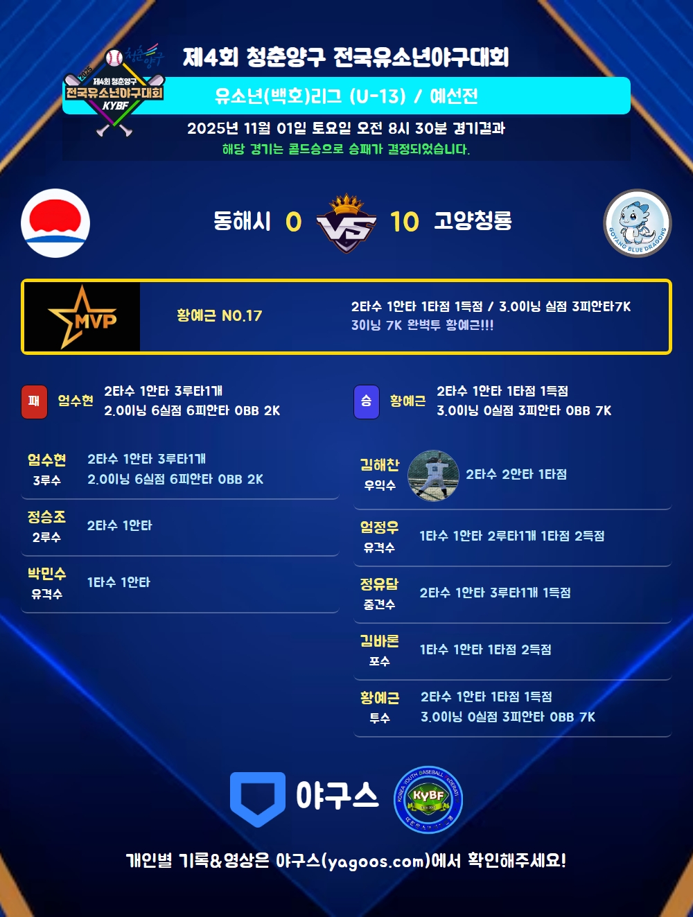 | 고양청룡 | 2 | 1 | 7 | 10 | 9 | 0 | 3 | 0 |