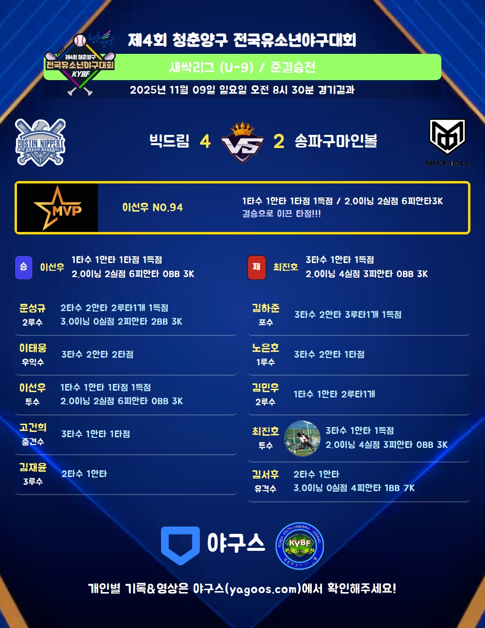 | 4 | 一 | 최지안 (177) | 삼진 | - | 2야선 | - | 4구 | - | 2 | - | - | 1 | - | - | 1 | 1 | 0.000 |