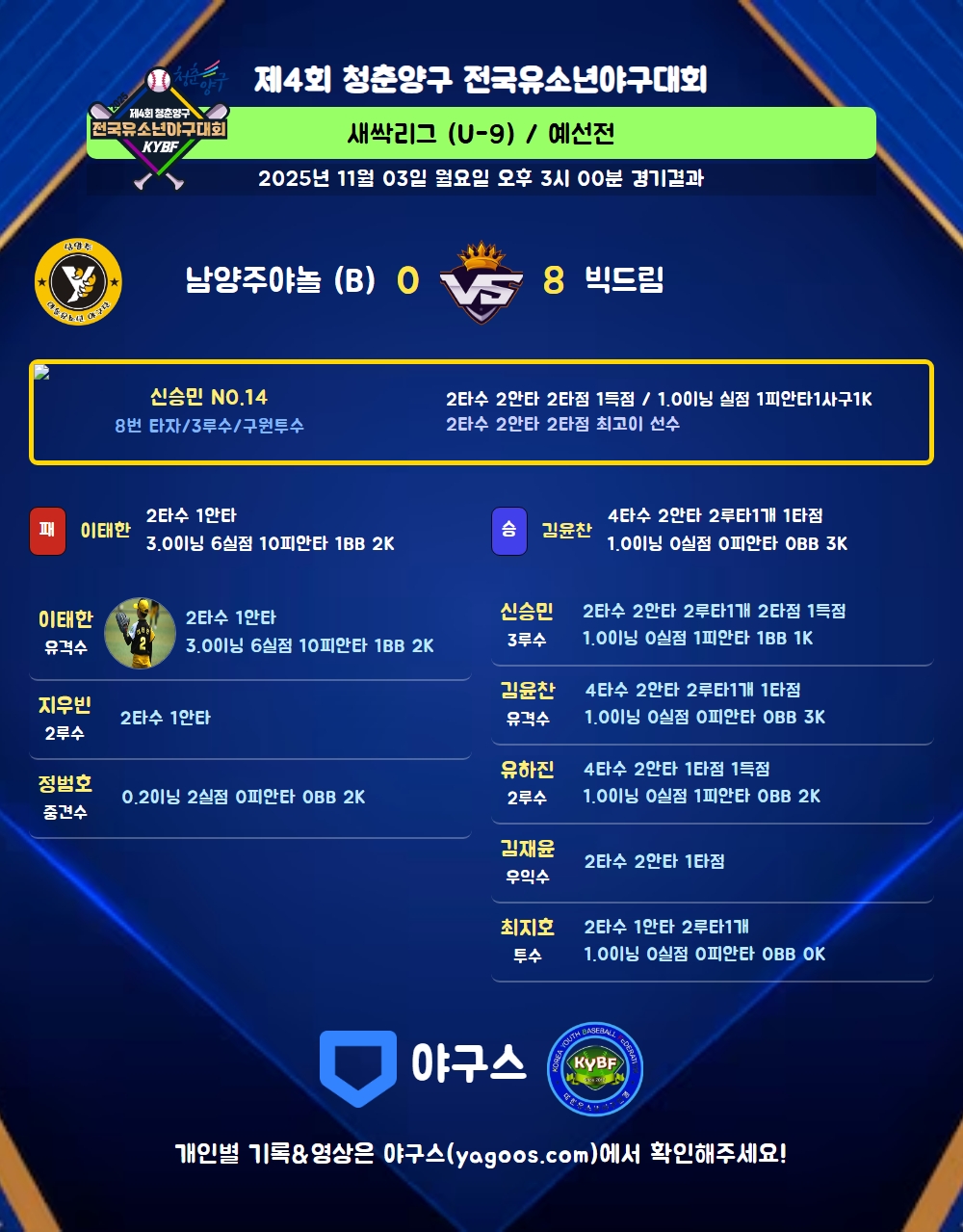 | 8 | 三 | 신승민(14) | - | 유내안 | 중전2(2타점) | 4구 | - | 2 | 2 | 2 | 1 | - | - | 1 | - | 1.000 |