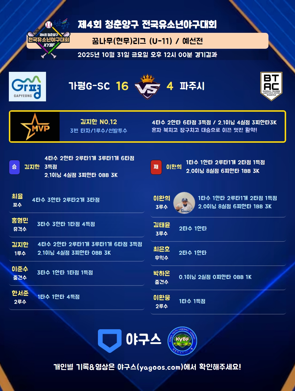 | 2루타 | 김지한(12) 최율(2) 이환희(4) |